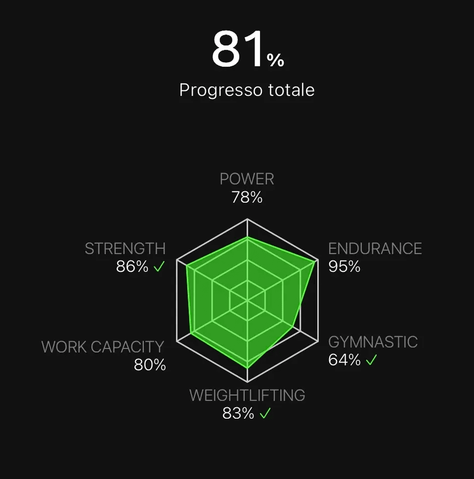 Attraverso il radar delle capacità tieni sotto controllo forza, endurance, ginnastica e work capacity. Visualizzi i tuoi progressi, individui le priorità e sai sempre dove stai migliorando e perché.